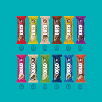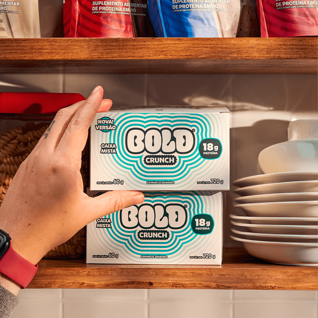 A caixa mista da nova BOLD Crunch chegou para quem não quer escolher só um sabor. São 12 unidades com os quatro sabores da linha: Cookies & Cream, Morango & Chantilly, Pistache e Brigadeiro — todos com 18g de proteína e 60g por barra.
